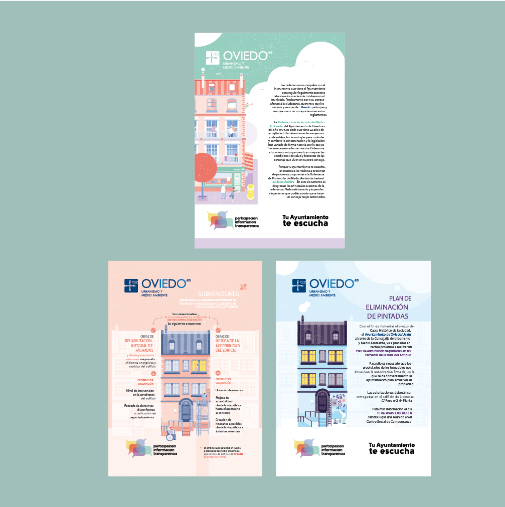 DESCRIPCIÓN: Hemos realizado varios trabajos para la Concejalía de Urbanismo y Medio Ambiente del Ayuntamiento de Oviedo con el fin de informar a la población sobre diferentes cambios en las normativas así como ayudas o subvenciones de las que pueden beneficiarse .