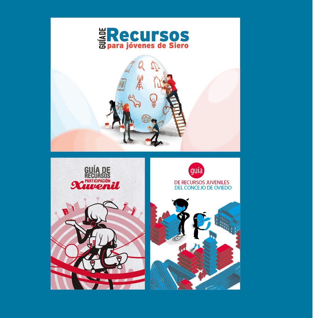 DESCRIPCIÓN: El sector de las políticas de juventud ha sido probablemente en el que más hayamos trabajado a lo largo de estos años. Prueba de ello es que hemos elaborado las guías de recursos juveniles de tres de los concejos asturianos más poblados: Oviedo, Gijón y Siero. Nos hemos encargado de organizar los contenidos, el diseño, la maquetación y la ilustración, dándole siempre un toque diferencia- do con referencias locales.