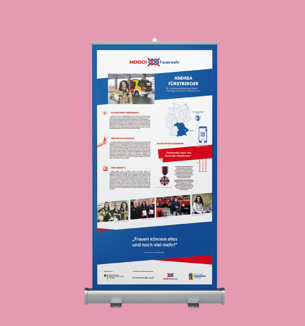 DESCRIPCIÓN: "MENSCH Feuerwehr!" es el nombre del proyecto de la Deutscher Feuerwehrverband (Asociación de los Bomberos Alemanes), una organización que nace en 1853 y que aglutina a las distintas agrupaciones de bomberos de Alemania. El objetivo de este proyecto es la apertura intercultural del servicio de bomberos a grupos que están ahora mismo infrarrepre- sentados. Hemos elaborado su identidad corporativa y una exposición modular itinerante que visibiliza la importante labor que realizan las personas que trabajan en el departamento de bomberos.