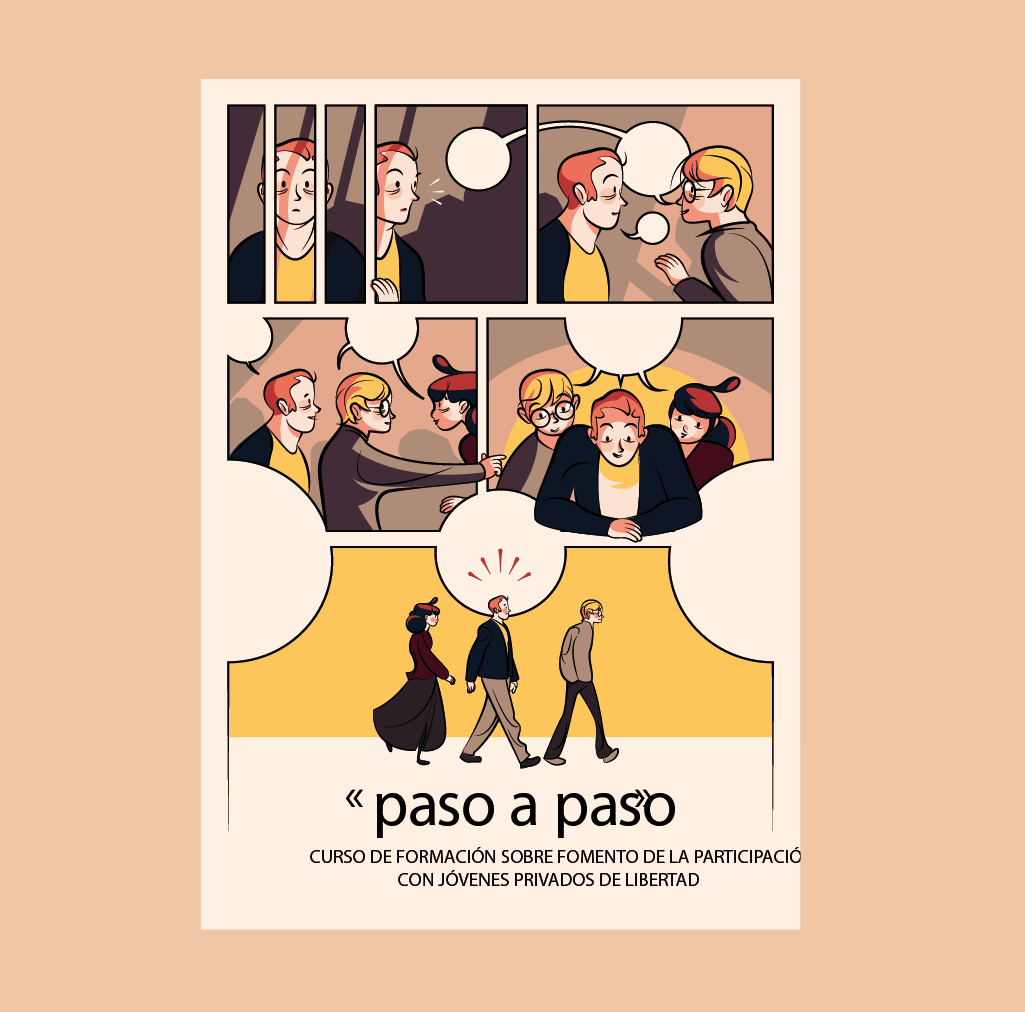DESCRIPCIÓN: “Paso a paso” es el nombre de un programa de voluntariado de los Conseyos de Mocedá d’Uviéu y Asturies que, a través de mediado- res juveniles, realizan intervenciones de participación social con jóvenes privados de libertad en el Centro Penitenciario de Villabona. En esta ocasión nos escargamos de diseñar la imagen del programa de formación de voluntariado. Utilizamos los espacios entre viñetas con una intencionalidad narrativa de una pequeña historia muda.